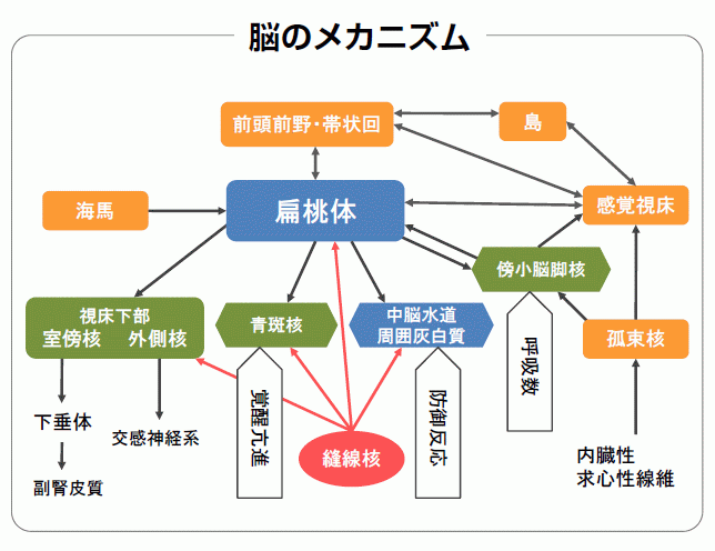 脳の下部には生命維持に欠かせない働きをしている脳幹部がありますが、ここに「網様体」という部位があって、五感の知覚をトータルの刺激として「視床」に伝えています。視床は網様体から伝えられた刺激を大脳に送りますが、大脳の底の方に位置する「線条体」で、視床から送られてきた刺激を調節して大脳に送っています。この調節には神経伝達物質であるセロトニンやドーパミンが正常に働いて刺激を抑制していますが、このセロトニンやドーパミンが減少すると線条体の機能不全がおこります。線条体の機能が悪くなると、網様体から伝わってきた刺激が十分に調節されずに大脳(大脳新皮質、大脳辺縁系)に送られてしまいます。刺激が調節されずに大脳に送られると、大脳は不安と恐怖におびえ緊張が高まって、大脳全体が興奮して覚醒した状態になります。
